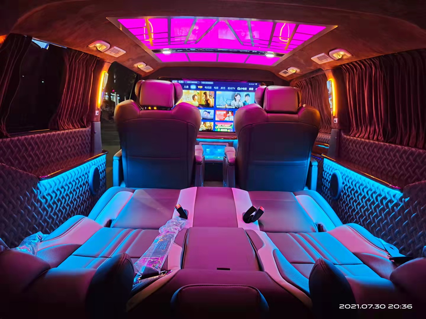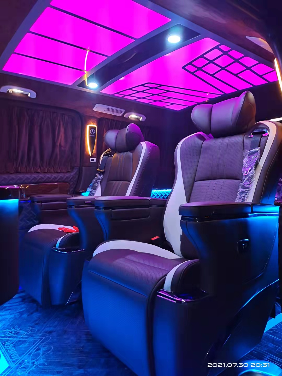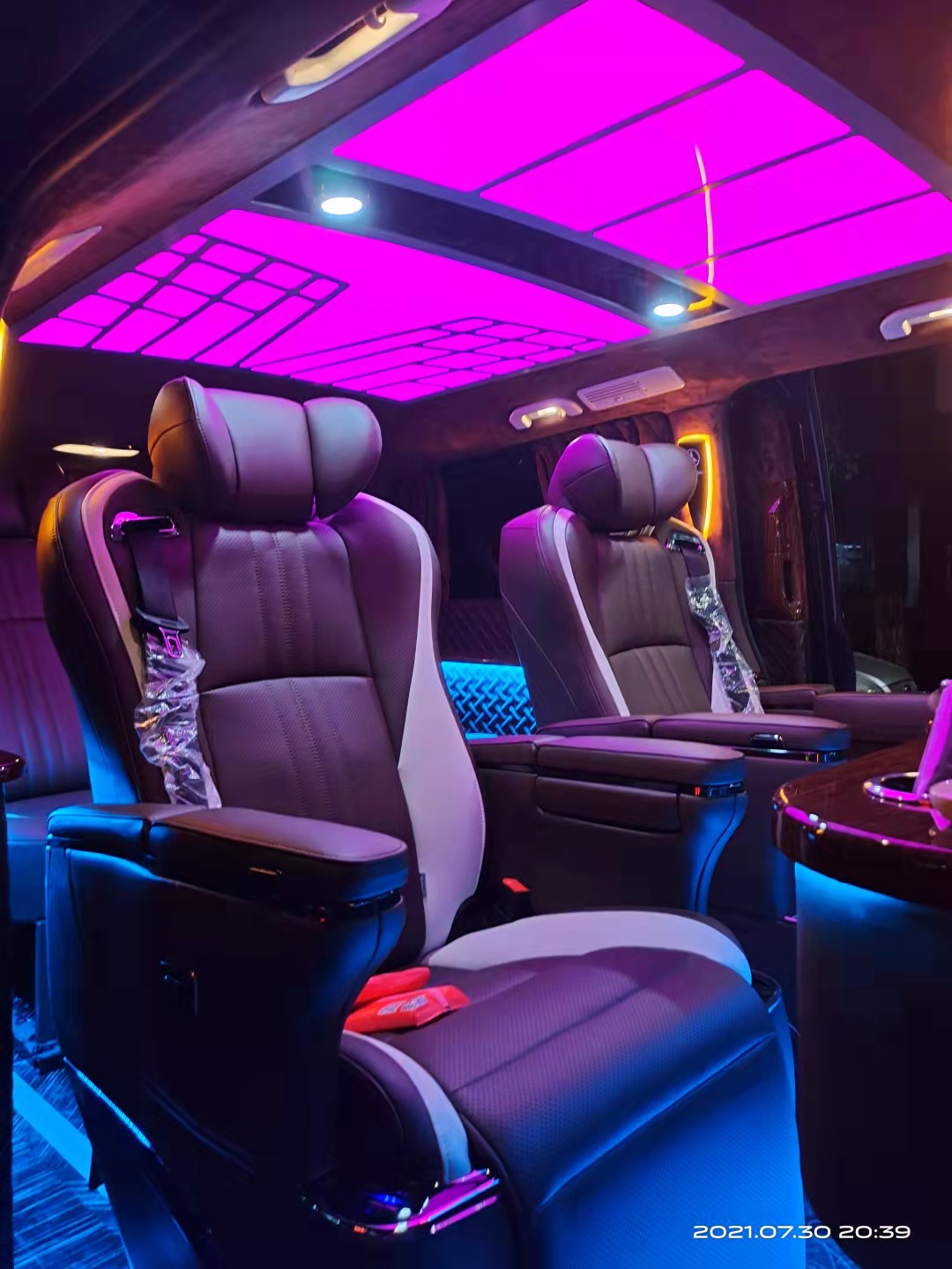 奔馳商務(wù)車國產(chǎn)唯雅諾軸距3200mm,車內(nèi)高1338mm,寬1630mm,在這個長4993mm寬1905mm的空間里設(shè)計人員巧妙地安放進(jìn)了五張座椅,在出廠狀態(tài)下,乘員區(qū)的座椅是相對而坐的,這樣的設(shè)計。